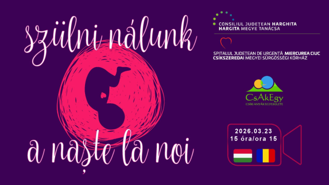 A Csíkszeredai Megyei Sürgősségi Kórház, partnerségben a Csíki Anyák Egyesületével, 2026. március 23-án, hétfőn, 15 órai kezdettel szervezi meg az ehavi szülőszoba-látogatást. A rendezvényen a kórház szülészeti és újszülöttgyógyászati osztályainak szakemberei ismertetik a babát váró párokkal a legfontosabb tudnivalókat. Dr. Horváth Zalán szülész-nőgyógyász szakorvos, dr. Fülöp Hajnal újszülöttgyógyász szakorvos, Tamás Mónika szülésznő, laktációs tanácsadó, Tulit-Incze…