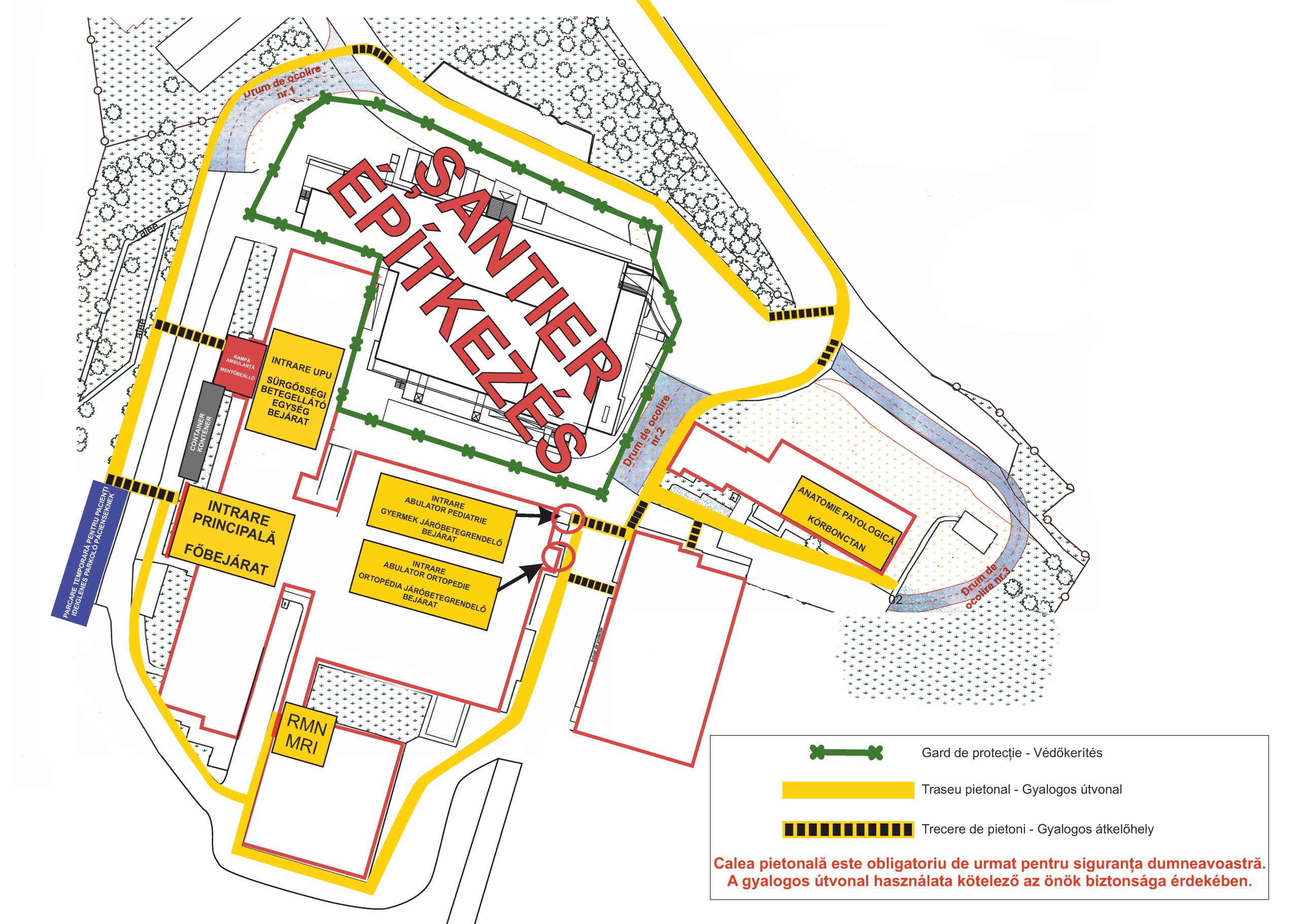 Pe harta de mai jos regăsiți traseele pietonale din jurul clădirii principale a spitalului, punctul de intrare la cabinetul de pediatrie, intrarea la cabinetul ortopedie, intrarea la Unitatea de Primiri Urgențe, intrarea principală.
