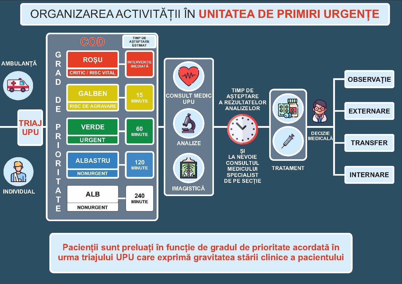 Dacă problema dumneavoastră nu reprezintă o prioritate medicală imediată, este posibil să așteptați mai mult timp până la eliberarea unui loc pentru consultații și a unui medic care să vă consulte. Alți pacienți pot fi preluați imediat chiar dacă au sosit după dumneavoastră, având o prioritate medicală mai urgentă. Sunteți rugați să nu încercați sub nicio formă să influențați decizia personalului medical în vederea obținerii unui acces mai rapid. În cazul în care vă simțiți mai rău, vă rugăm să contactați asistentul din punctul de triaj pentru o reevaluare a stării dumneavoastră. Mulțumim pentru înțelegere.